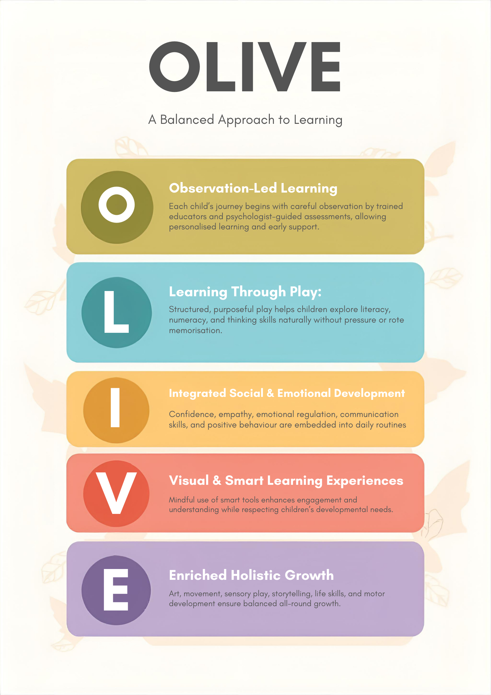 Every aspect of Oli-Kinder—from curriculum design to classroom layout is rooted in research-backed early childhood practices and a deep respect for childhood as a critical developmental phase.